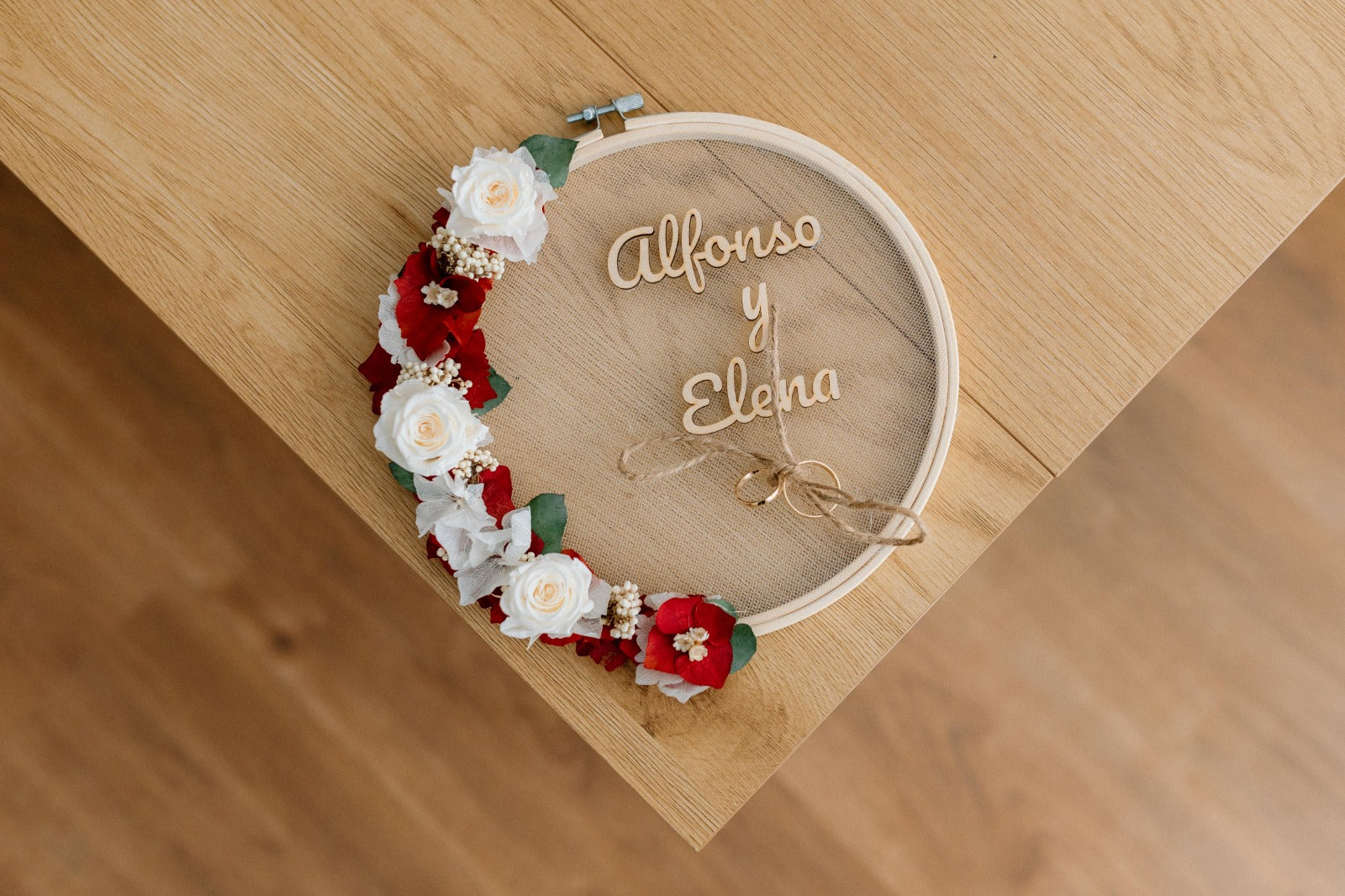 Porta alianzas decorado con flores preservadas con placa grabada personalizada